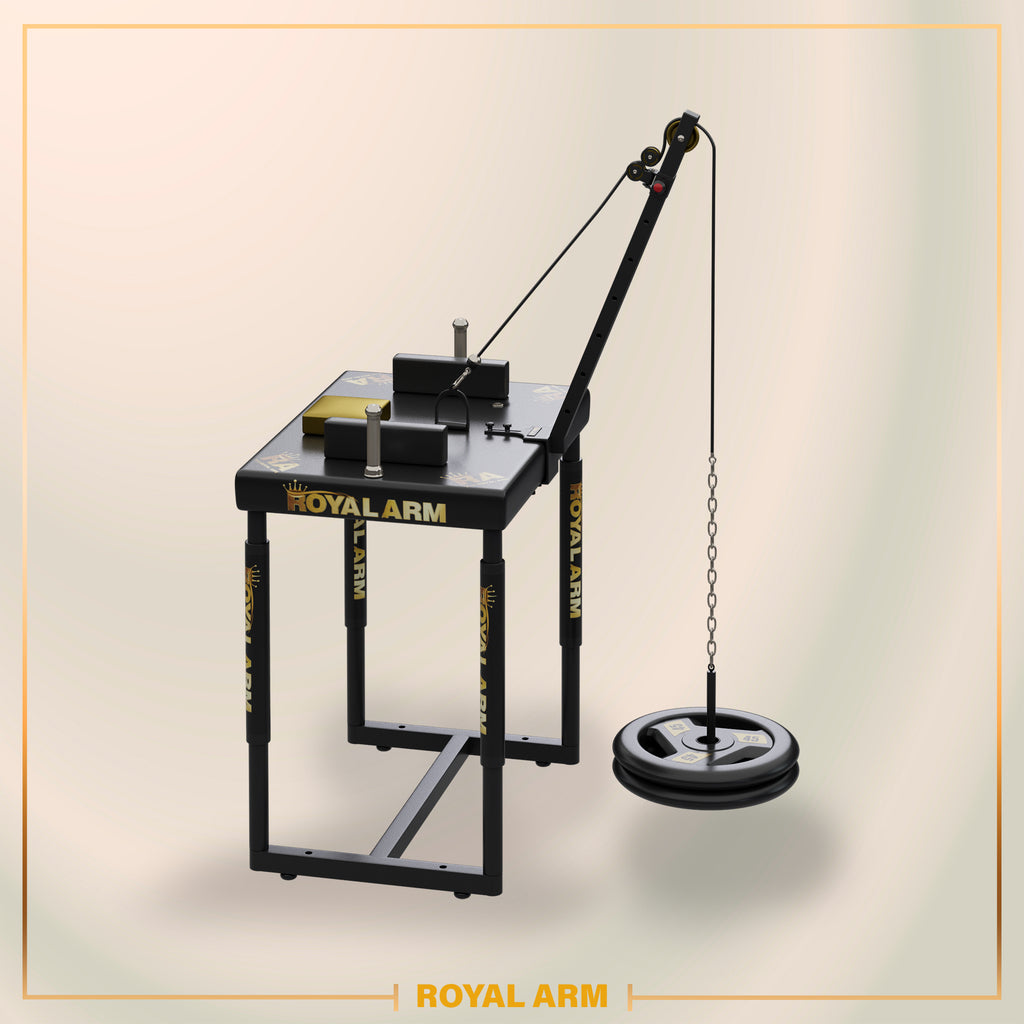 Introducing Royal Arm – Elevate your armwrestling game with Royal Arm's premium equipment. Our Armwrestling Table, crafted with top-quality materials and precision craftsmanship, offers unmatched stability and durability for both beginners and seasoned pros. Pair it with our versatile Adjustable Pulley, designed to enhance your strength training with a wide range of exercises targeting key muscle groups. Together, they provide the ultimate setup to take your armwrestling performance to the next level. Train like a champion with Royal Arm.